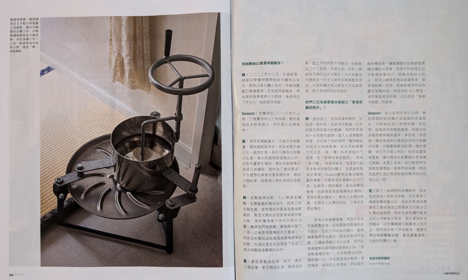2024年10月11日星期五《明報周刊》2915期專題《茶園復興 本土茶葉重生 香港茶香再起》刊登本會訪問,本會三位核心成員李天安先生(Season)、李妍小姐(藍籃)和陳梓霆先生均有受訪,三人談及從個人經歷與製茶初心到本地製茶展望。